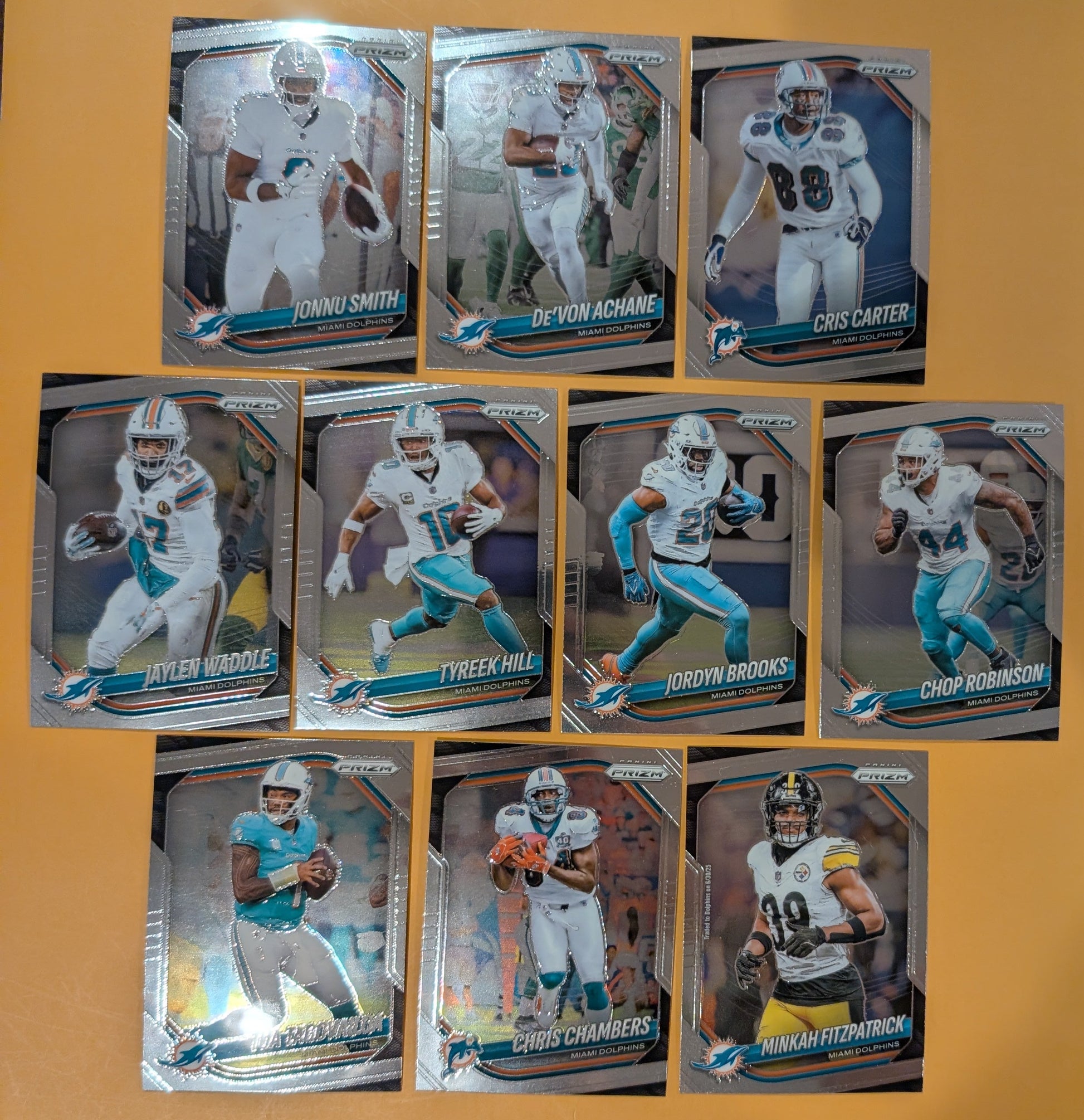 Players included are Tyreek Hill, Jaylen Waddle, De'Von Achane and the rest of the pictured cards.