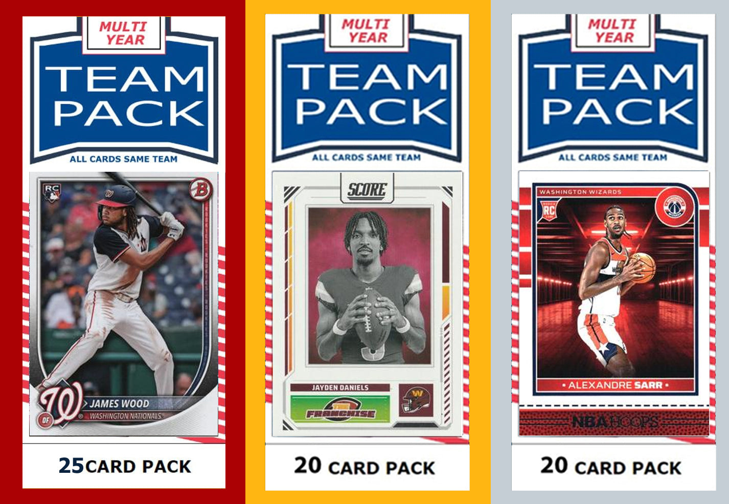 This Washington DC Combo Pack contains 1 pack each of the Washington Nationals, Washington Commanders and Washington Wizards